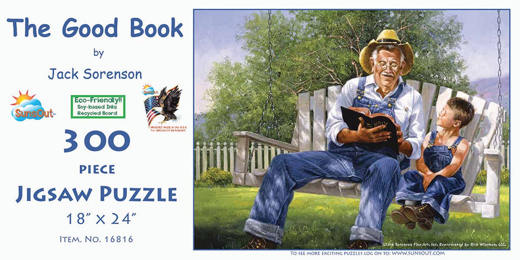 300 piece puzzle, 18" x 24", artwork by Jack Sorenson Bible, church, elder, child, swing