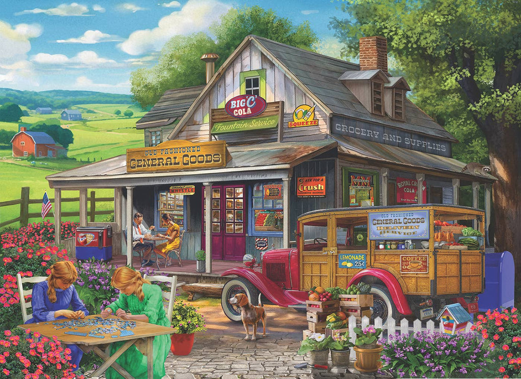 500 pc puzzle - 19.25" x 26.625" - Artist: Bigelow Illustrations LARGER SIZE PIECES FOR EASIER HANDLING general store, nostalgia, country, antique car