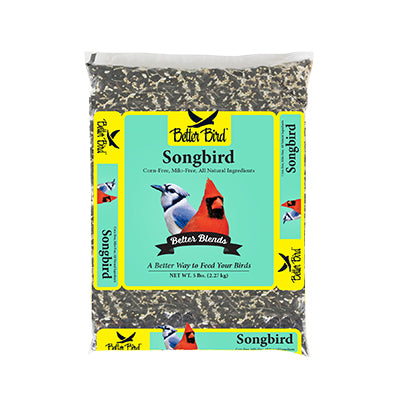 Better bird Songbird Food is an all natural seed free of corn and milo. Great for attracting many types of wild birds including cardinals, buntings, finches, woodpeckers, nuthatches, and chickadees.