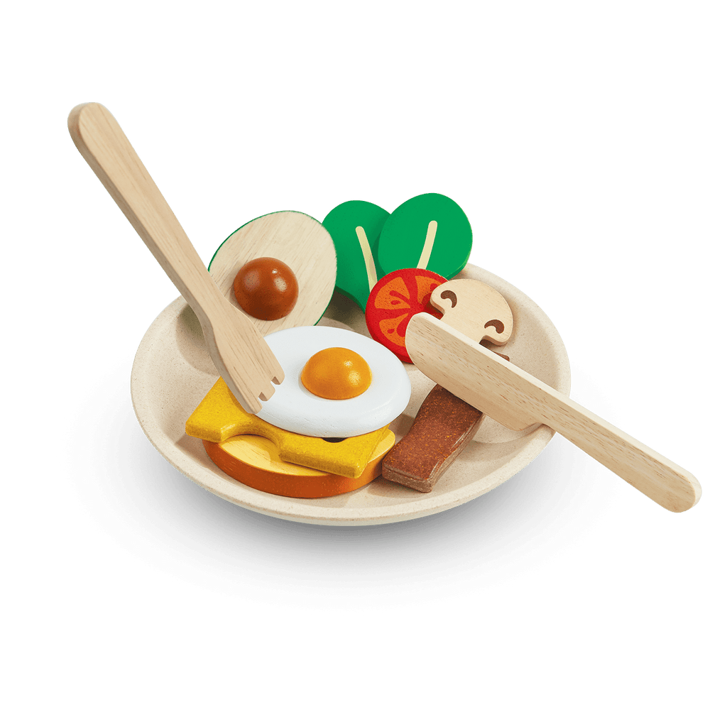 Breakfast is served! This set includes a plate, silverware, slice of bread, half of an avocado, 2 leaves of baby spinach, a bacon strip, sunny-side-up egg, mushroom, slice of tomato and slice of cheese.