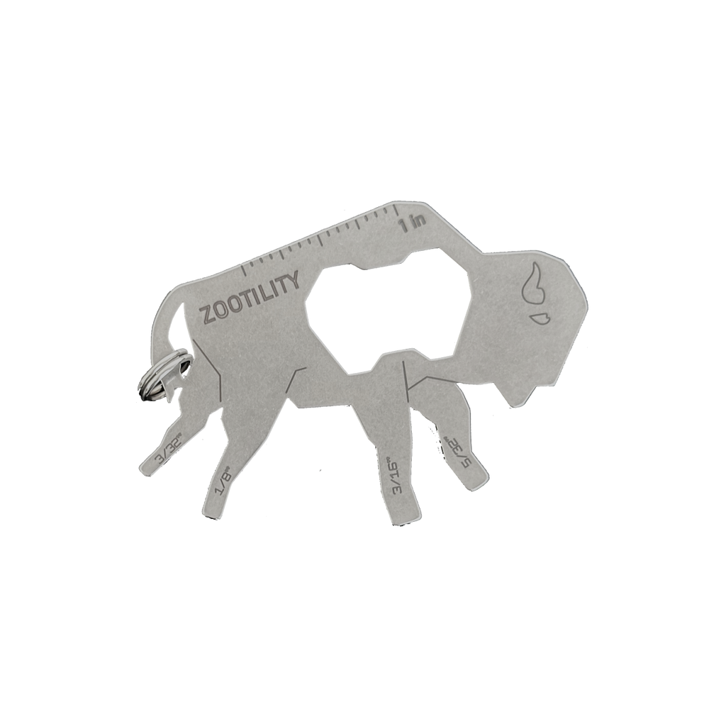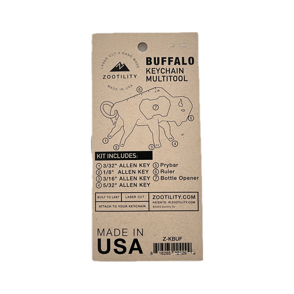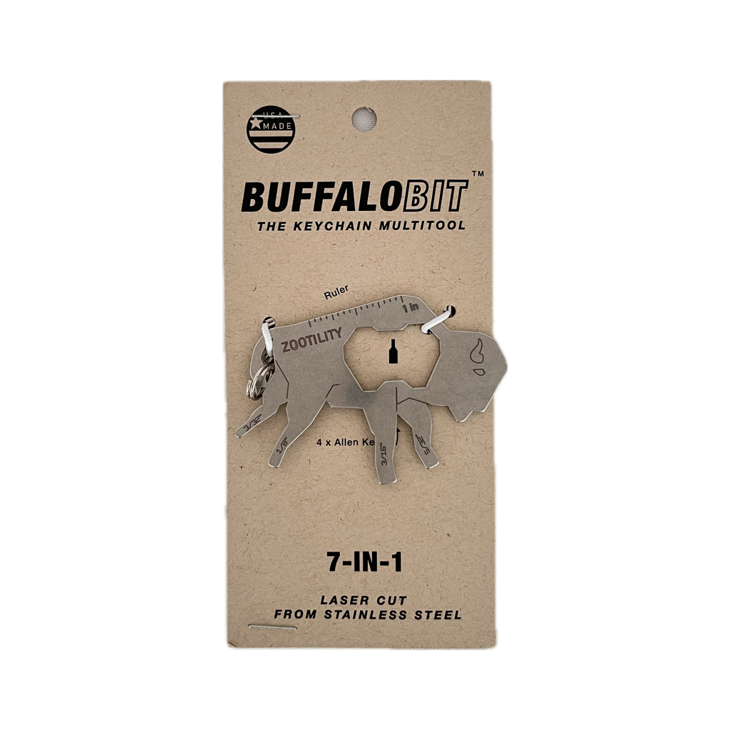 Meet the Buffalo Bit™ 7-in-1 Keychain Multi-Tool by Zootility, the perfect companion for any adventure. Born from Kickstarter and now crafted in the woods of Maine, this tool is built to last. It's the embodiment of Zootility's commitment to re-imagine products with a responsible approach. With its compact size, it easily fits into your pocket, making it the perfect on-the-go accessory. This multi-tool is an essential addition to your keychain, ready to assist you in various tasks while showcasing your love for the outdoors.