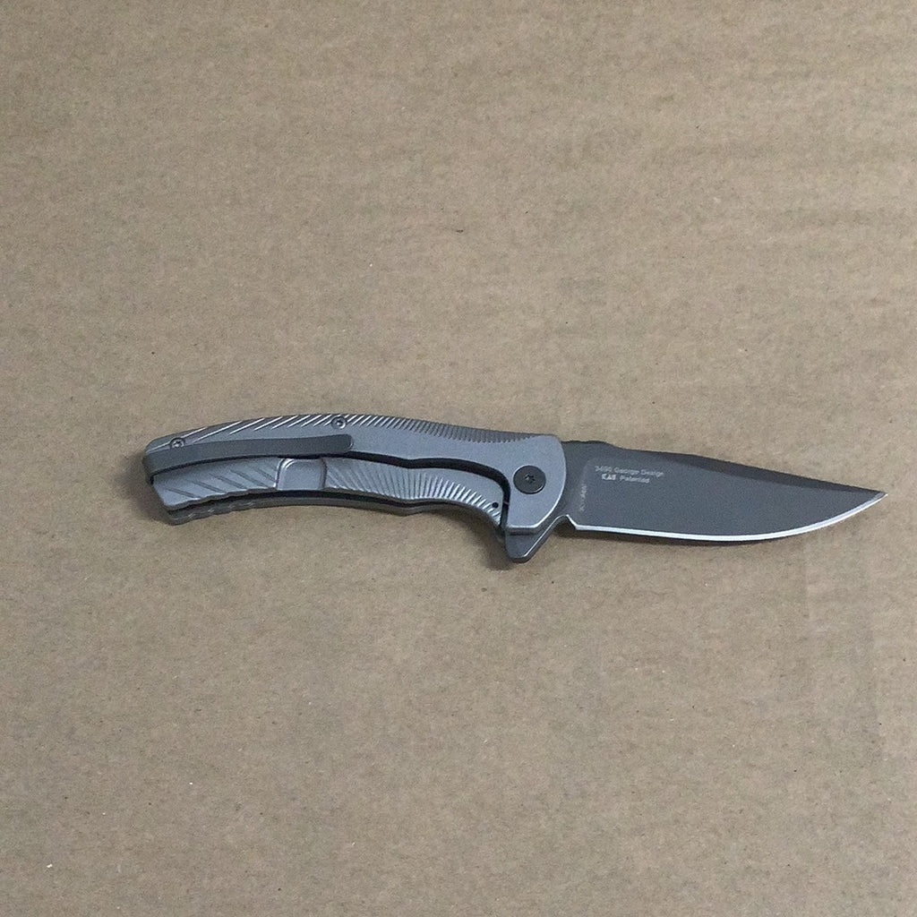 The knife’s handle is made from bead-blasted stainless steel, providing a secure grip and a timeless aesthetic. The handle also features a custom pivot and backspacer, adding a touch of elegance to its design.