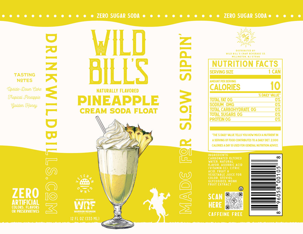 Wild Bill's – Pineapple Zero Sugar Soda Pop (12 oz) Zero Sugar | No Artificial Flavors, Colors, or Preservatives | Caffeine-Free Tropical Sweetness, Zero Guilt. Enjoy the bright, golden flavors of juicy pineapple blended with natural sweetness, golden honey, and caramelized cake notes. This zero-sugar soda delivers a rich, tropical refreshment without any artificial additives. Tasting Notes: - Upside-Down Cake - Tropical Pineapple - Golden Honey Perfect Pairing: Pairs perfectly with jerk-spiced salmon or mahi mahi for a vibrant, flavorful meal. Why You’ll Love It: - Zero sugar, no artificial flavors, colors, or preservatives - Caffeine-free and clean-label ingredients - Bold, tropical flavor with guilt-free refreshment Veteran-Owned & Operated Wild Bill’s proudly supports veterans by providing meaningful employment, partnering with nonprofits, and offering discounted franchise opportunities.