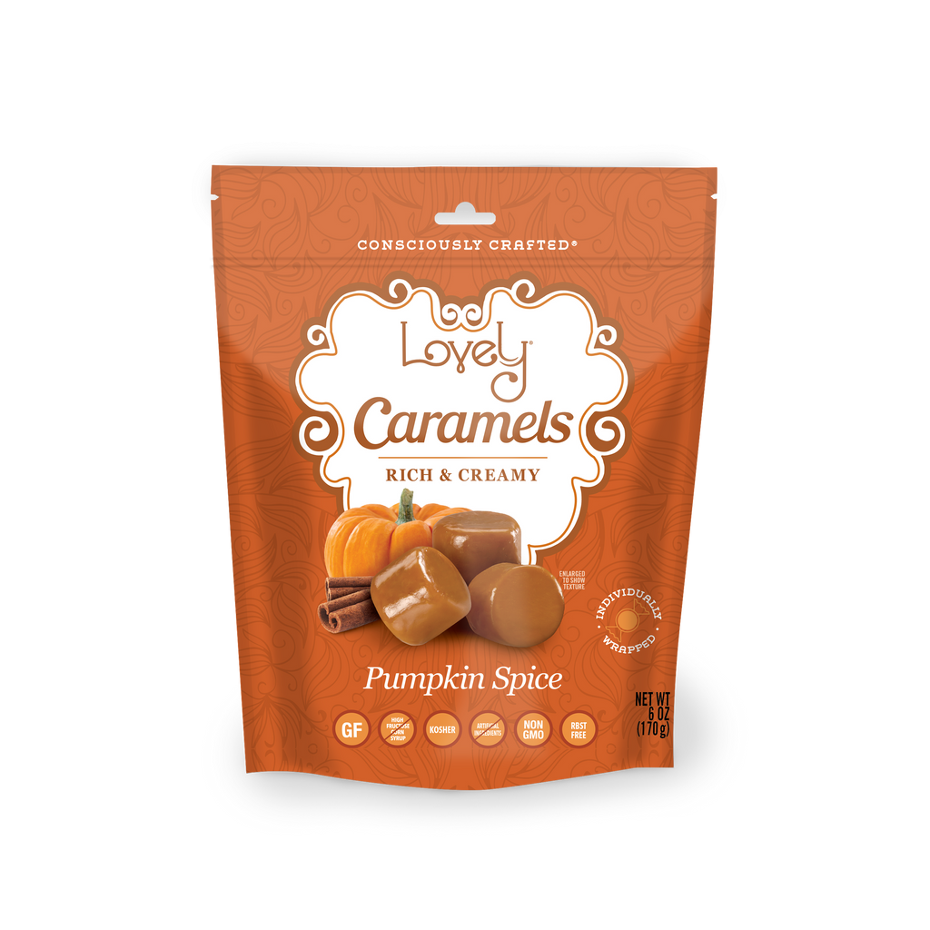 Our decadent and rich Original Caramels with pumpkin spice flavor! Non GMO, No HFCS, No Soy. Rbst free milk, Kosher and GF certified. Resealable bags.