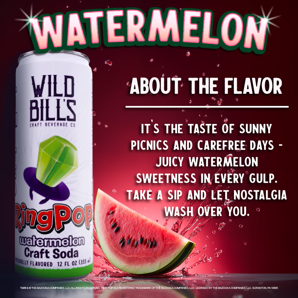 Wild Bill’s – Ring Pop Watermelon (12 oz) Pure Cane Sugar | Caffeine-Free | Gluten-Free | Vegan Refreshing, Juicy, and Full of Nostalgia Flavor Description: Beat the heat with Ring Pop Watermelon! Enjoy the juicy sweetness of watermelon that brings to mind sunny picnics and carefree days. Take a sip and let nostalgia wash over you. Tasting Notes: - Sweet Watermelon - Juicy Honeydew - Ripe Green Apple Perfect Pairing: Pair this refreshing soda with gourmet barbecue pulled pork sliders. The bright watermelon flavor perfectly balances the smoky, tender pork for a burst of fresh flavor in every bite. Veteran-Owned & Operated Wild Bill’s proudly supports veterans by aiding their transition from military to civilian careers through nonprofit partnerships, discounted franchise fees, and meaningful employment opportunities.