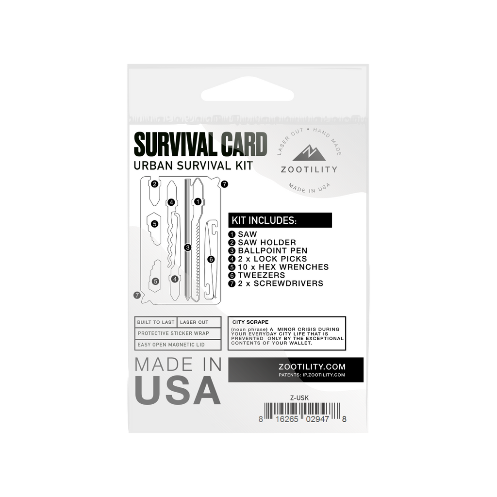 A credit-card-sized multi-tool kit, designed to navigate urban emergencies with ease, and slim enough to fit right into your wallet. From lockouts to spontaneous repairs, this kit equips you with a suite of tools, ready for action at a moment's notice.